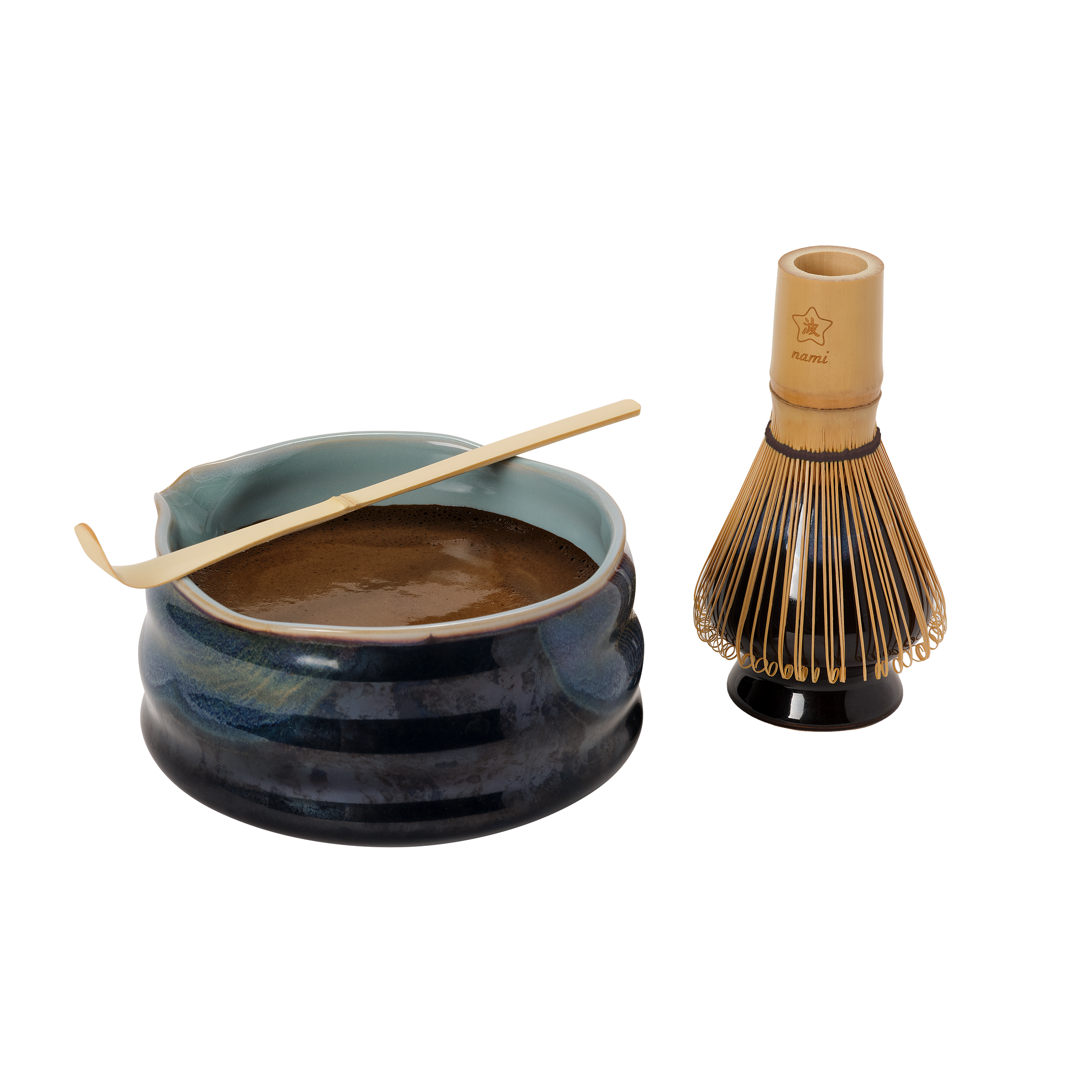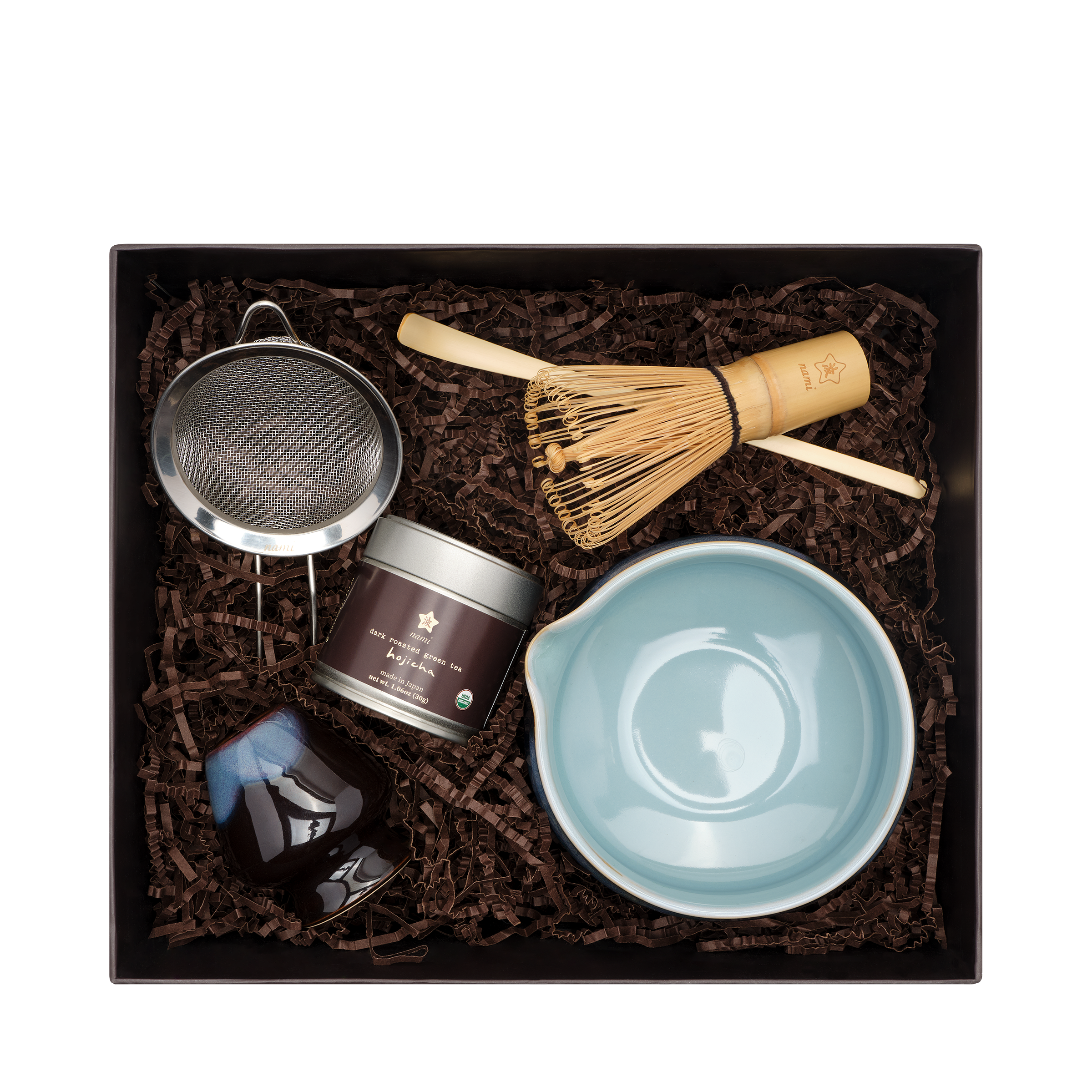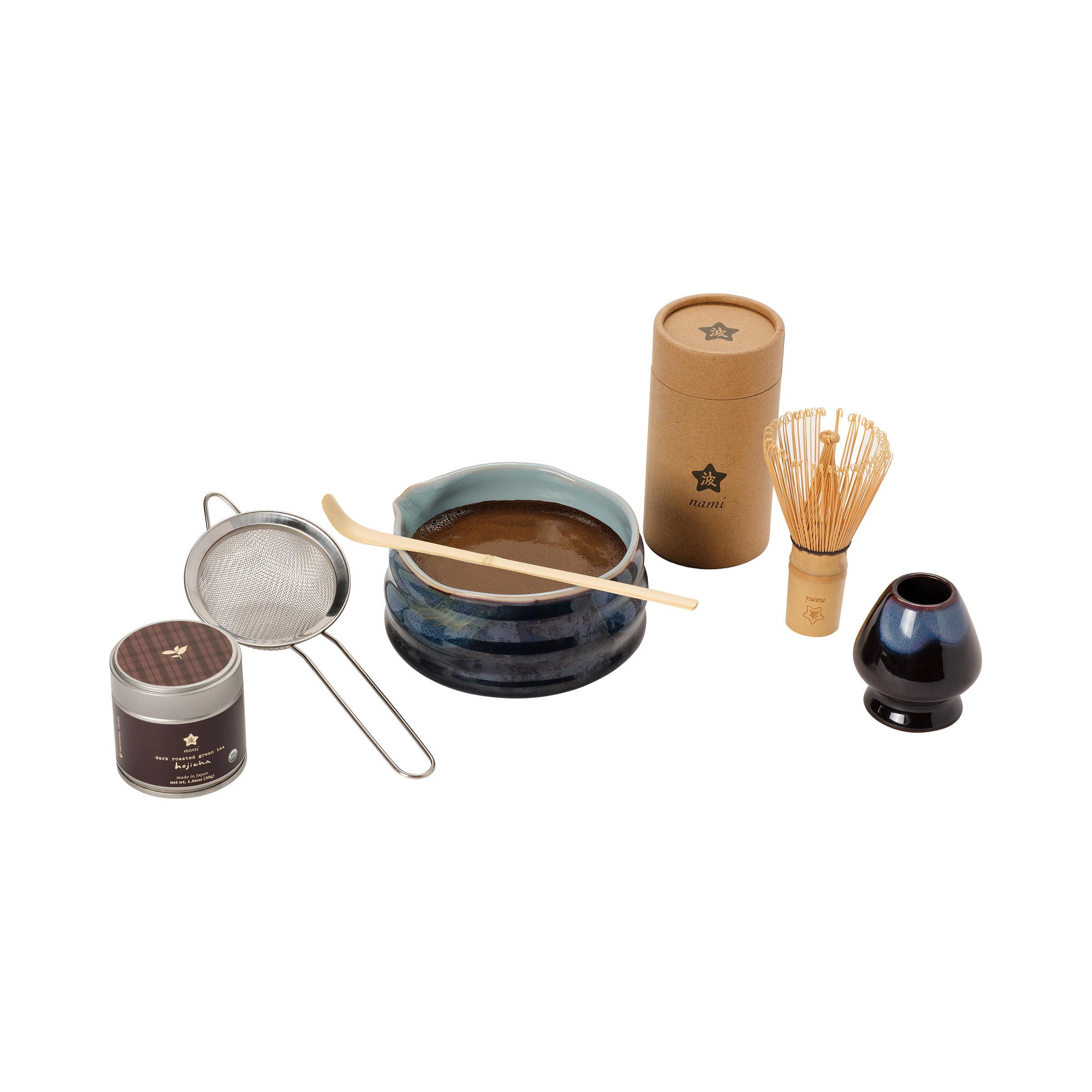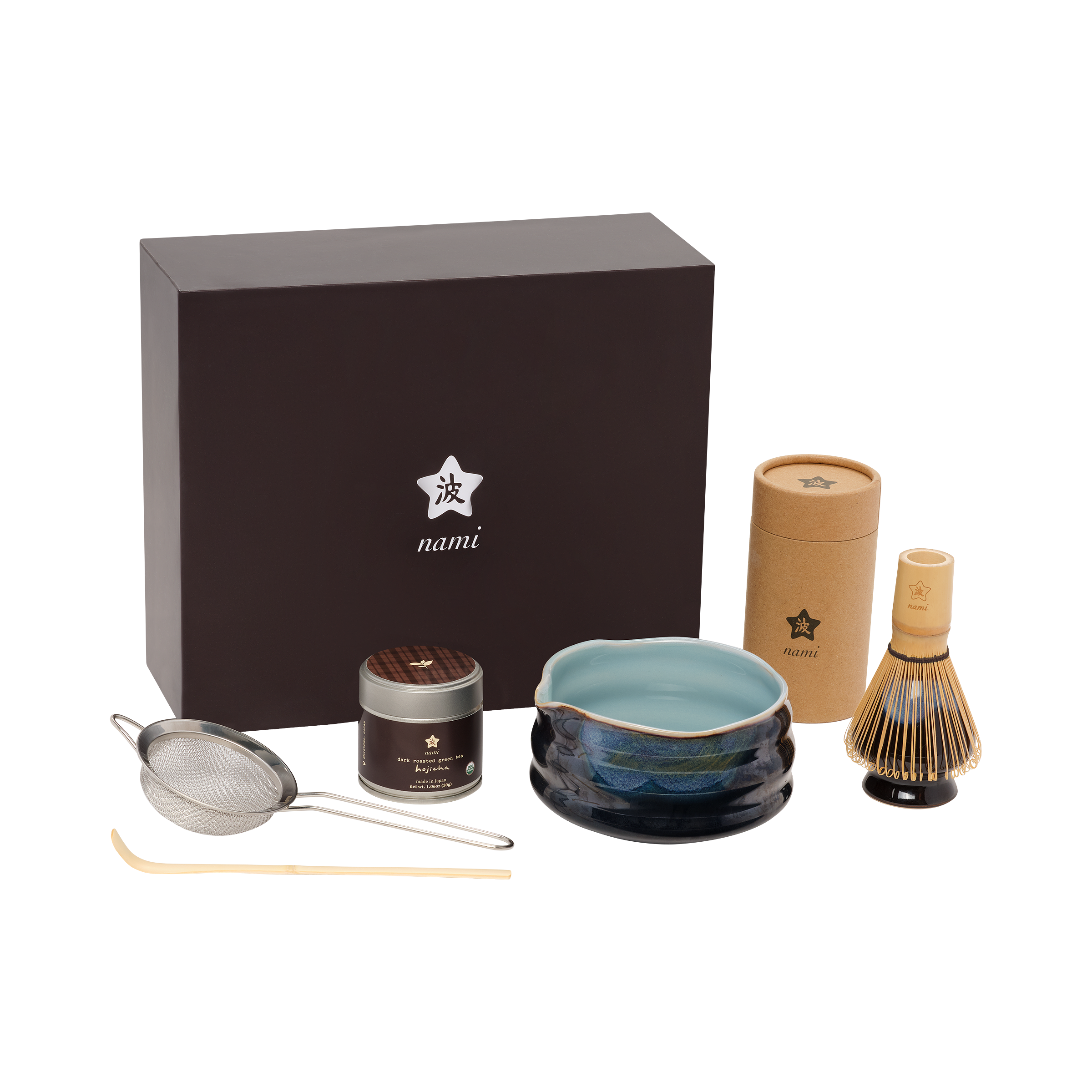 Match your hojicha latte to this stunning dark brown and light blue themed dark roast hojicha kit.